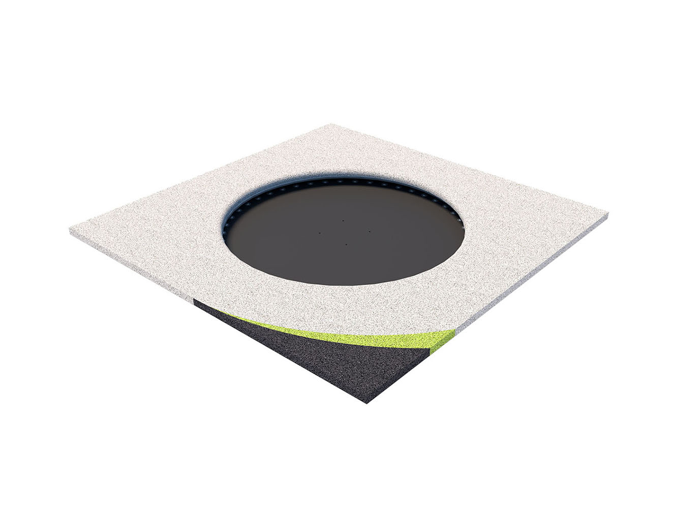 Trampolina o średnim rozmiarze z naszej unikatowej linii kwadratowych kraterów. Jest to seria produktów, która łączy w sobie zalety trampolin kwadratowych i okrągłych. Kwadratowe kratery charakteryzują się większą niż w przypadku innych typów trampolin powierzchnią amortyzującą. Utrudniony dostęp do mocowania maty to lepsze zabezpieczenie przed wandalizmem. Pomimo okrągłej powierzchni do skakania trampoliny te zachowują możliwość bezpośredniego łączenia w zestawy. Produkt sprawdzi się na terenie szkół, placów zabaw, parków czy innego rodzaju terenów służących do rekreacji.