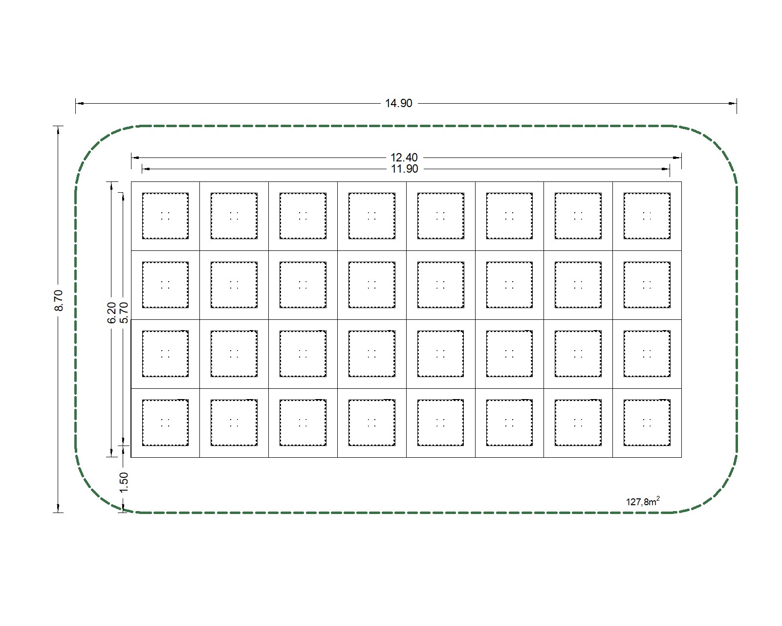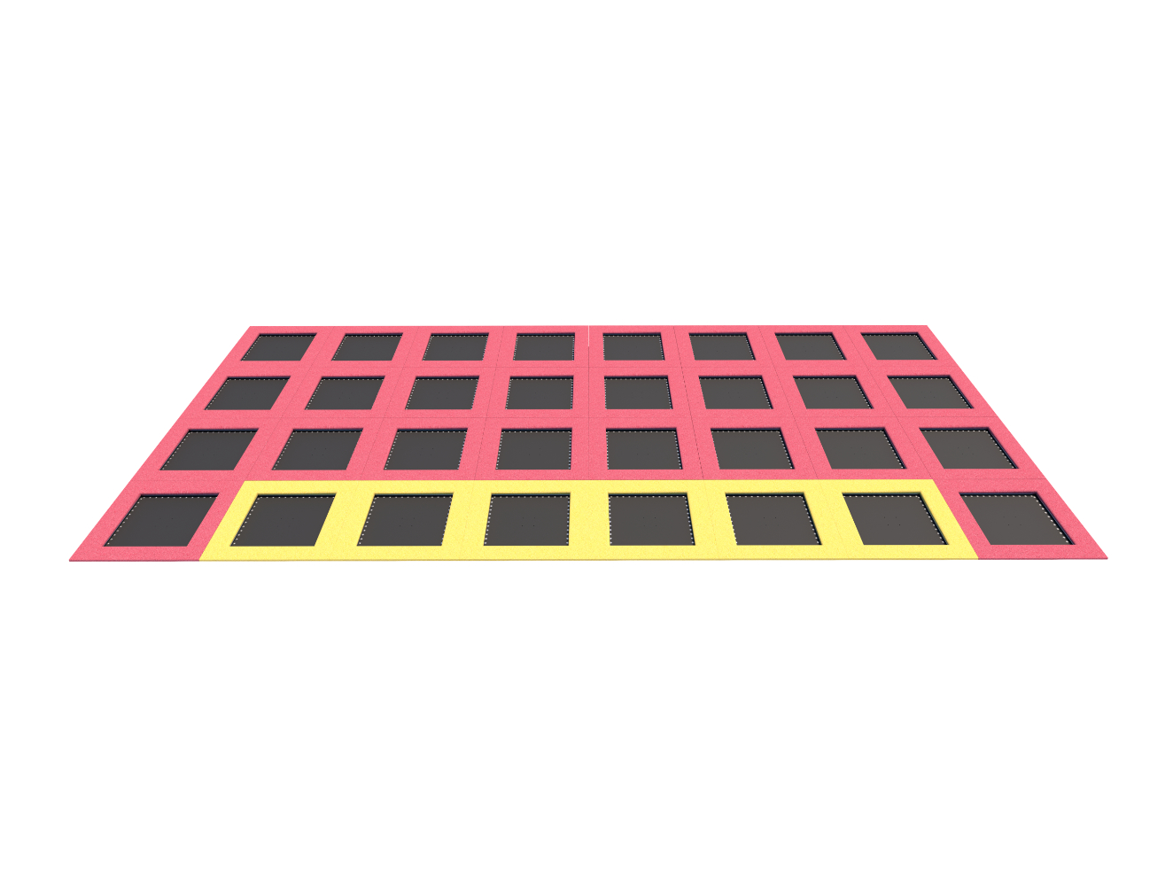 Największy w naszej ofercie zestaw to propozycja, w której postanowiliśmy wykorzystać maksimum możliwości na stosunkowo małej przestrzeni. Pole kangurów tworzy aż 24 trampolin, co daje możliwość jednoczesnej zabawy przez  wielu użytkowników oraz prowadzenie treningów i zajęć fitness dla dużych grup. Zestaw doskonale sprawdza się w przestrzeni publicznej charakteryzującej się dużą frekwencją i samodzielnie tworzy turystyczną atrakcję oraz autonomiczną  strefę rekreacji i zabawy. To produkt dla tych, którzy chcą się wyróżnić i być przed innymi w kreowaniu przestrzeni publicznej.